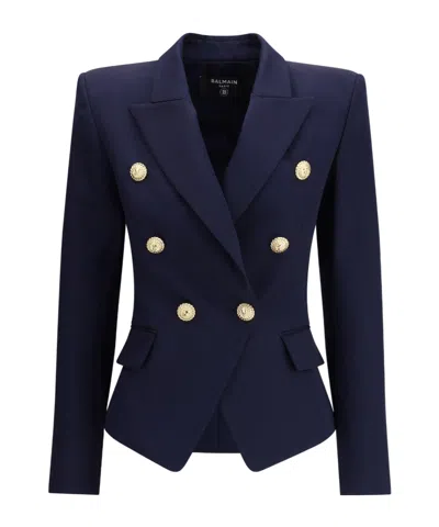 The Balmain double-breasted Blazer is an icon of structured and decisive style. Characterized by stiff shoulders and peak lapels, it enhances the silhouette with an impeccable tailoring line. The front closure with gold embossed buttons adds a touch of luxury, while the two welt pockets with flap complete the design with elegance and functionality.Sku: FF1SI505WB08_6UCSeason: AW25Fit: RegularComposition: GENERAL 100% Fleece WoolMADE IN PORTUGAL