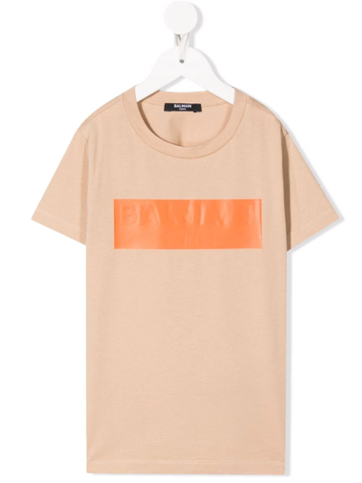Beige/orange cotton embossed-logo T-shirt from Balmain Kids featuring embossed logo to the front, round neck, short sleeves and straight hem.