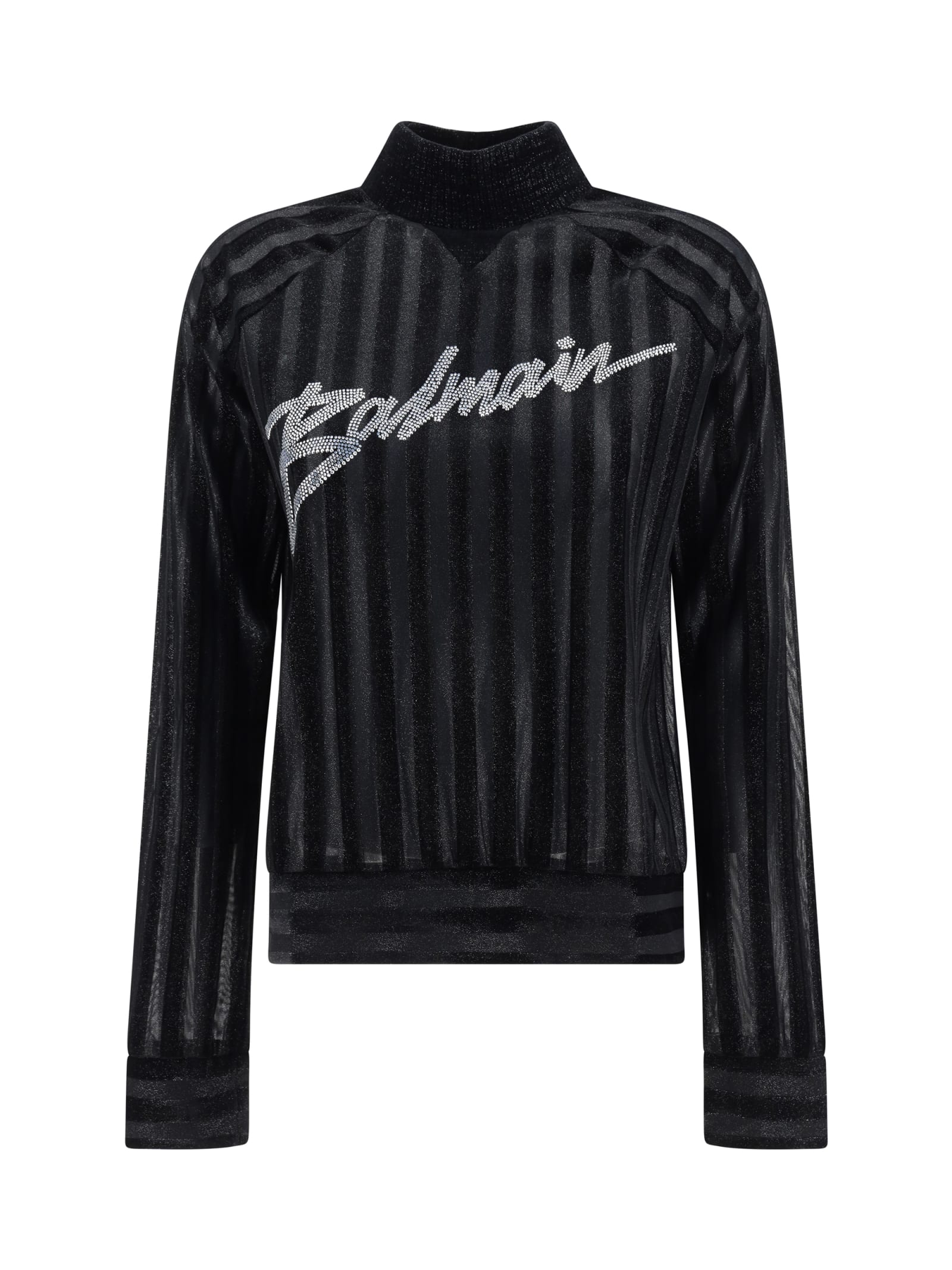 Turtleneck sweater by balmain, ribbed turtleneck, semi-transparent glitter band design, iconic brand monogram made of rhinestones applied on the front, regular fit. Composition: 10% % Elastane, 90% % Polyester