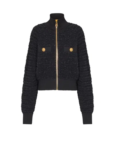 The Black Embellished Button Jacket by Balmain seamlessly marries Parisian heritage with avant-garde sensibility. Crafted from a structured, yet supple boucle fabric, this jacket exudes modern sophistication, accentuated by its subtle sheen and opulent golden accents. A gracefully cropped boxy silhouette anchored by a wide, elastic waistband and cuffs lends refined definition, while tailored sleeves provide a contemporary edge. Striking decorative gold buttons and a central gold zipper imbue the piece with unmistakable elegance, elevating its deep black hue. The addition of two patch chest pockets with refined flaps further enhances functionality without compromising chic allure a masterstroke of Balmains legacy of bold embellishment and youthful vitality. Why choose this product? Luxurious boucle fabric with a distinctive texture and subtle luster Flattering boxy, cropped cut with sophisticated elastic details Elegant gold hardware and decorative buttons for iconic style Functional chest pockets with refined flaps A timeless piece from the legendary house of Balmain Composition: 55% Viscose 55% Viscose 13% Fabric 13% Fabric 10% Polyamide 10% Polyamide 8% Cotton 8% Wool 8% Wool 8% Cotton 6% Polyester 6% Polyester