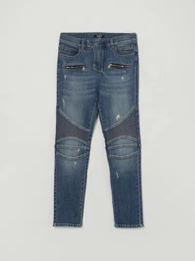 BALMAIN Jeans. denim, brand logo, solid color, dark wash, mid rise, belt loops, zipper closure, hook-and-eye closure, five pockets, stretch, wash at 30degree c, dry cleanable, do not bleach, do not tumble dry, iron at 150degree c max, straight-leg model. 98% Cotton, 2% Elastane