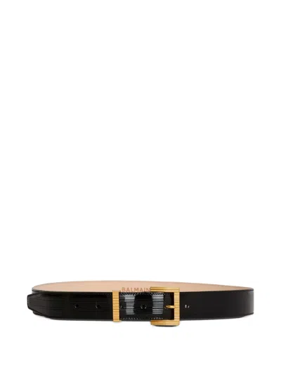 Perfume belt in striped patent leatherAdjustable fasteningBuckle and loop in striped gold metalEmbossed Balmain logoWidth: 3 cmMain material: 100% calfskinMade in ItalyItem: EN0WA177LPIS Perfume belt in striped patent leather Adjustable fastening Buckle and loop in striped gold metal Embossed Balmain logo Width: 3 cm Main material: 100% calfskin Made in Italy