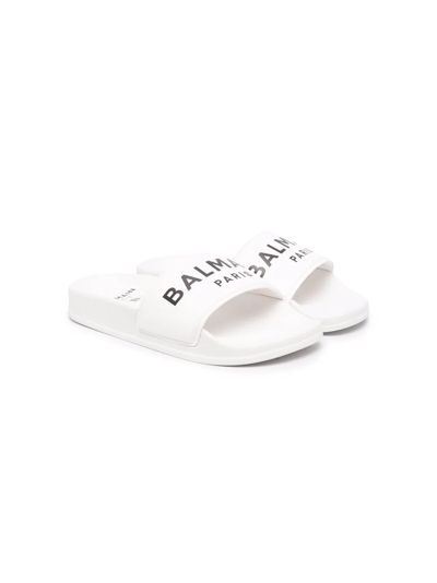White logo-print pool slides from Balmain Kids featuring slip-on style, logo print to the front, branded insole and flat rubber sole.