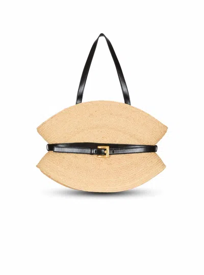 Shuffle' medium shoulder bag in woven raffia and calf leather, double turn belt detail with antiqued metal buckle on the front, double fixed handle, tie tie closure, suede effect fabric lining. Handcrafted product, any imperfections are to be considered characteristics of uniqueness.. Colour. : Beige. Composition. : 100% raphia. Country Of Manufacture. : Italy. Dimension. : W 45.5 x H 31 x D 16 cm. MPN. : FN1DQ023TRBOGWN. .