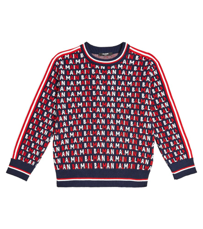 BALMAIN Kids' Monogram Crewneck Cotton Sweater In Blue