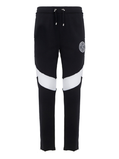 Black/white cotton monogram-patch cotton joggers from Balmain featuring colour-block panelled design, logo patch to the front, frayed detailing, drawstring fastening waist, two side inset pockets, rear patch pocket and frayed hem.