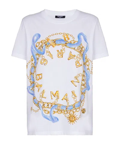 Exuding modern sophistication, this white T-shirt by BALMAIN PARIS stands as a statement piece for discerning wardrobes. Crafted from smooth, ultra-premium cotton, its classic, subtly relaxed silhouette is complemented by a graceful crew neckline and short sleeves, ensuring effortless refinement with every wear. The front boasts a vivid, central print luxurious golden chains and dynamic blue ribbons entwine, punctuated by opulent jewelry motifs such as a bespoke medallion, radiant golden charms, and a sunburst accent. Scattered letters ingeniously compose the iconic BALMAIN PARIS logo, affirming its exclusive heritage and unmistakable designer provenance. Dlaczego warto kupi ten produkt? Luxuriously soft, high-grade cotton for lasting comfort Iconic and intricate front print, embodying Parisian couture artistry Timeless, versatile silhouette suitable for distinctive styling Signature designer detailing for elevated exclusivity An essential piece from one of Frances most prestigious fashion houses Composition: 100% Cotton