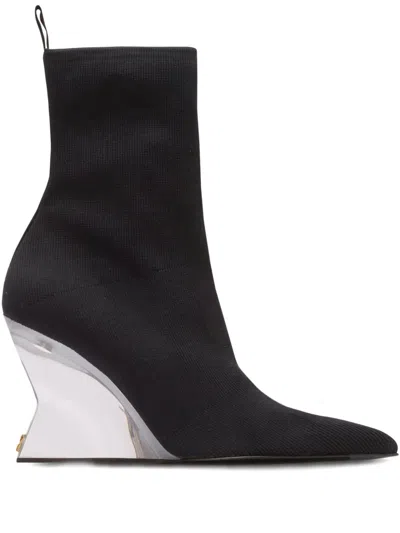 black knit texture pull tab pointed toe wedge heel gold-tone logo detail