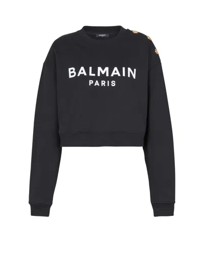 Printed Balmain Paris sweatshirtRound neckline3 decorative embossed gold metal buttons on the shoulderLong sleevesContrasting Balmain Paris logo printed on the frontRibbed trimRegular cropped cutModel measures 179cm and wears a size SMain material: 100% cottonMade in PortugalItem: EF1JQ002BB02100% of the cotton fibres used to make this garment are certified and organically farmed