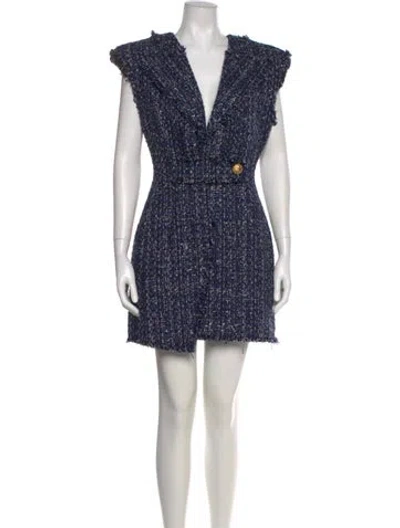 Balmain A-Line Dress Blue & Metallic Printed Short Sleeve with V-Neck Exposed Zip Closure at Back Designer Fit: Dresses by Balmain are typically designed for a slim fit. | Balmain Printed Mini Dress in Blue/Metallic, Women's US8, FR40 | M