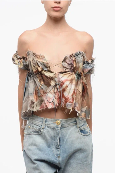 BALMAIN Printed Silk Off-shoulder Top In Multi