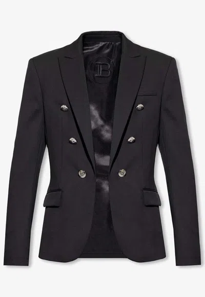 Open front; Decorative silver metal ''Lion Head'' buttons at front Peak lapel; Long sleeves, structured shoulders, three-button cuffs Front welt pockets with flap, chest pocket, internal pockets Central slit at bottom back Satin lining with embroidered B logo Slim fit Black color 100% Wool; Lining: 65% Acetate, 35% Viscose Made in Slovakia
