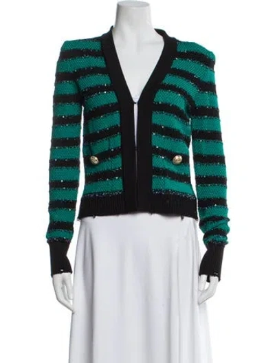Balmain Evening Jacket Black & Green Striped Sequin Embellishments & Collarless Patch Pockets & Hook and Eye Closure Designer Fit: Designed for a slim fit, those with a curvy figure may wish to take one size up. | Balmain Striped Evening Jacket in Black/Green, Women's US2, FR34 | XS
