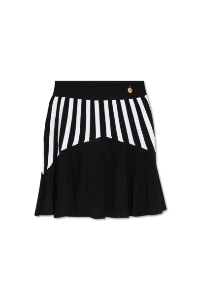 Introducing the exclusive STRIPED SKIRT from the renowned fashionhouse BALMAIN. This design combines sophistication and modernity,paying homage to timeless elegance.The skirt features a FLARED SILHOUETTE, giving it a breezy and elegantlook. The pleating at the upper part adds structure and style, whilethe distinctive black-and-white vertical stripe pattern at the uppersection creates a unique contrast, harmonizing with the solid blacklower part. The whole piece is complemented by a subtle, goldendecorative element - the designer's logo placed on the elasticwaistband.Made from high-quality material consisting of viscose and polyester,ensuring comfort and durability. The design and materials make theskirt perfect for various outfits, both elegant and casual.WHY SHOULD YOU BUY THIS PRODUCT? * Unique, breezy flared silhouette * Elegant pleating and vertical stripe pattern * High-quality material ensuring comfort * Subtle, golden detail with designer's logo * Elastic waistband ensuring a perfect fit Model`s MeasurementsHeight - 177cmBust - 83cmWaist - 61cmHips - 89cmModel is wearing size - 36