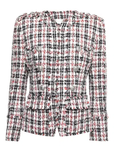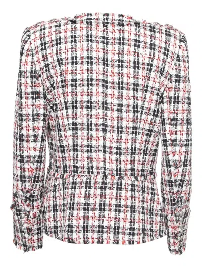 black plaid tweed prominent buttons structured shoulders frayed edges boxy shape Condition: GOOD. This previously owned and used item is in good condition with minimal signs of use. This may include fading of material or plating and scratches.