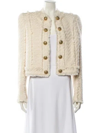 Balmain Evening Jacket Neutrals Tweed Pattern Fringe Trim Accent & Collarless Open Front Designer Fit: Designed for a slim fit, those with a curvy figure may wish to take one size up. | Balmain Tweed Pattern Evening Jacket in Neutrals, Women's US10, FR42 | L