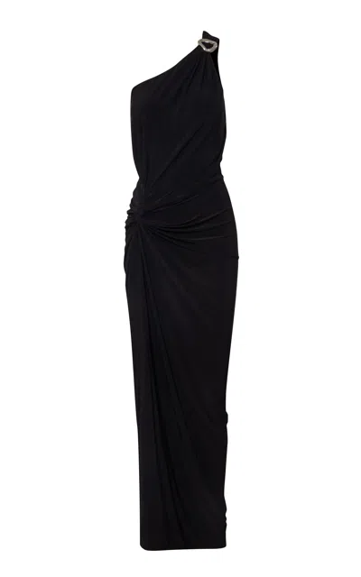 One shoulder maxi lenght dress with hardware detailing on shoulder and ruched detail on the hip