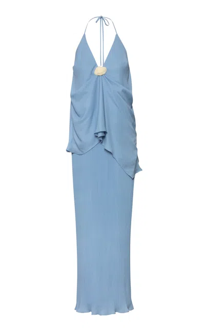 This sophisticated halter top in baby blue features a beautifully draped front with a central seashell embellishment; creating an elegant; flowing silhouette.