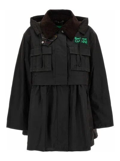 Barbour x ganni waxed cotton parka with removable hood, corduroy collar, front zip closure, zip at the waist for adjustable length, front patch pockets and patches on the check print sleeves.eeves.