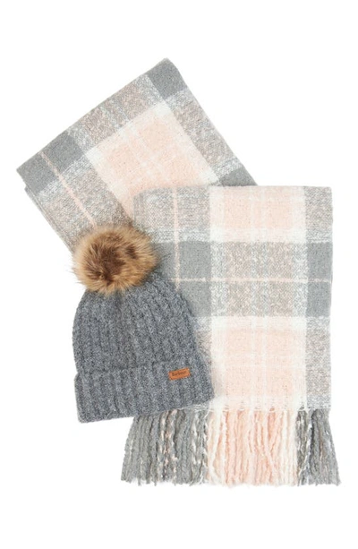 BARBOUR Saltburn Tartan Scarf & Beanie Knitted Set In Grey Rose