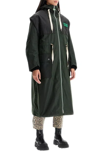 This parka, a collaboration between Barbour and Ganni, is made from waxed organic cotton canvas. It features plaid inserts and a back yoke with an embroidered maxi logo. The high collar has an adjustable integrated hood with drawstring, double zip closure, and flap pockets with snaps. Elbow patches and rubberized logo patches on the chest complete the style. Fully lined and equipped with an inner pocket. Oversized fit with a drawstring waist for adjustability. Model isBrand: BARBOUR x GANNIMaterial: 100%COSeason: Fall - winterMade in: Moldova@ Republic ofSize Info: UKColor: GreenWoman > Clothing > Outerwear > Parkas