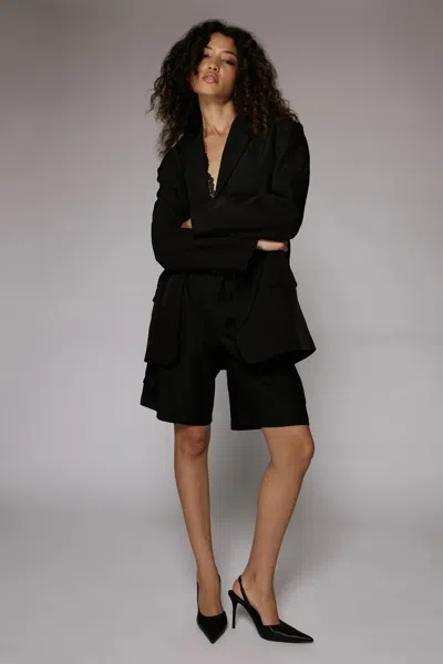 Classic chic. The Akia Oversized Blazer is a directional take on power suiting. Imagined in classic black with a masculine-inspired cut that is oversized with a boxy fit. A work to weekend style. SIZING: Oversized. AU: Model wears a size 8 / US: Model wears a size 4. FABRICATION: Main: 97% Polyester, 3% Elastane. Lining: 95% Polyester, 5% Elastane. - Two pig-noise self-covered buttons - Functional flap pockets with piped top edge - Jet pocket at chest