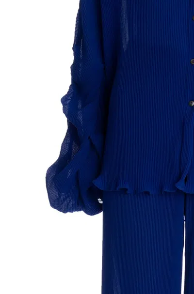 Pyjama-like set made of soft pleated-georgette. The blouse features gathered sleeves and the pants have elasticated waist for extra comfort.