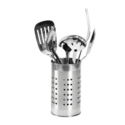 The basic essentials 7pc stainless steel tub of tools set includes six of the most used tools in any kitchen. The polished stainless steel makes it easy to maintain, are durable, and designed for cooks who appreciate their ease of care. The tub keeps the tools organized and close at hand. The set comes with a stainless steel tub, solid spoon, slotted spoon, serving fork, skimmer, ladle, and slotted spatula.# Pieces In Set: 7Included: 1 Slotted Spatula(s), 1 Fork(s), 1 Slotted Spoon(s), 1 Ladel(s), 1 Spoon(s), 1 Utensil Holder(s), 1 Slotted Skimmer(s)Features: Multi-FunctionIntended Use: CookingMeasurements: 4.33 Length/InchesMaximum Temp (f): 400 Degrees FBase Material: 100% Stainless SteelCare: Hand WashCountry of Origin: Imported