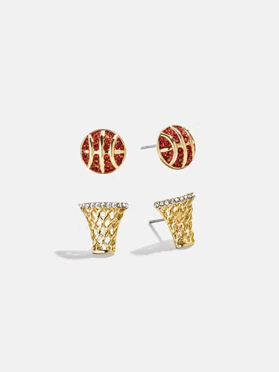 Get your head in the game with the Three-Pointer Earring Set. These basketball and hoop stud earrings score serious style points with their glittering glass stones and dainty silhouettes. Wear these earrings to tailgates, courtside, or even at-home watch parties. They’ll be a slam dunk no matter what. Please note this only comes with two sets of earrings, the basketballs and basketball baskets.