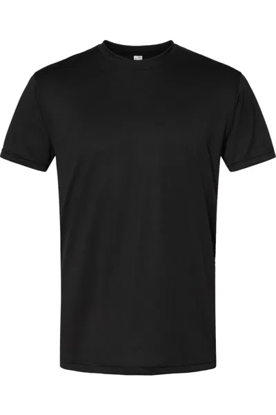4.5 oz./yd2, 100% polyester. Shoulder-to-shoulder taping. Two needle sleeve and bottom hem. Tear away label.