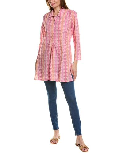 Introducing the 'Beach to Bistro Triangle Print Tunic' from BEACH TO BISTRO BY SIGRID OLSEN. This stylish tunic features a vibrant coral color/pattern, perfect for summer days. Measuring approximately 34 inches from shoulder to hem, this tunic is designed with a spread collar, left chest pocket, dual side on-seam pockets, and a pleated front for added style. Made from 100% cotton, this tunic is comfortable and easy to care for with machine wash instructions. Upgrade your wardrobe with this chic and versatile Beach to Bistro Triangle Print Tunic, perfect for casual outings or beach days. Model is 5'10 and is wearing a size small, measurements may vary slightly by size. Imported for your convenience.
