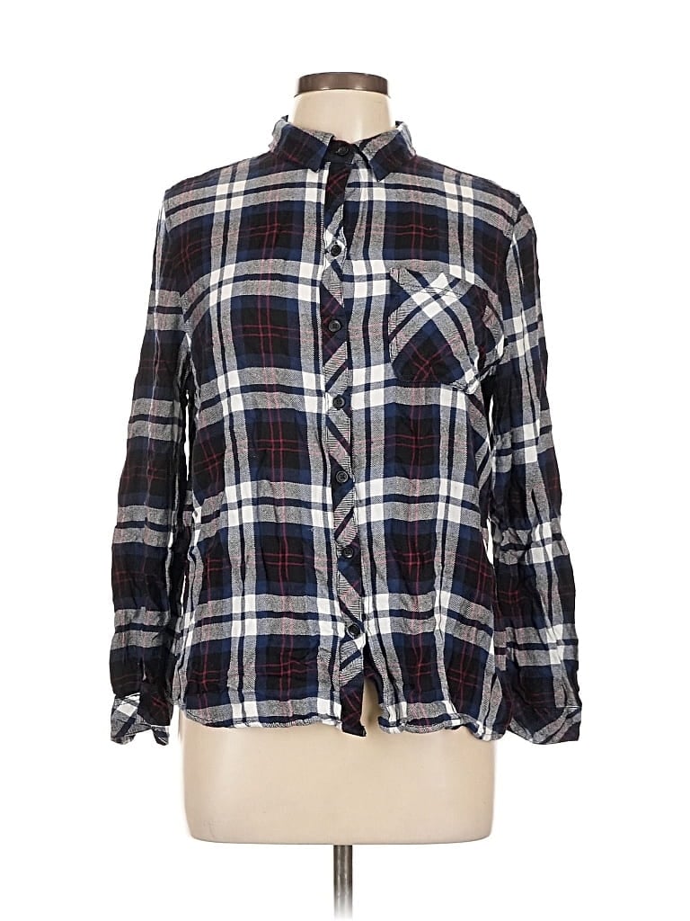 BeachLunchLounge Long Sleeve Button Down Shirt, Size: Large. Item Details: Blue, Plaid Pattern, Mock Neckline, Flannel, Women's Tops