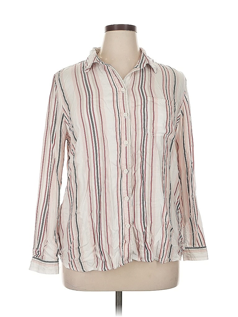 BeachLunchLounge Long Sleeve Button Down Shirt, Size: X-Large. Item Details: Ivory, Stripes Pattern, Collared Neckline, Long Sleeves, Frayed Edges, Women's Tops, Lyocell/Rayon