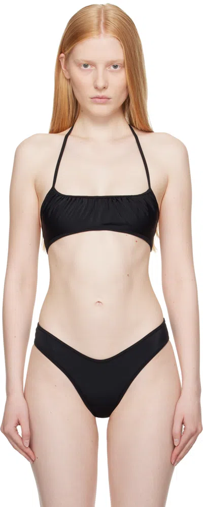 Stretch nylon jersey bikini top. · Gathering at scoop neck · Self-tie halter strap · Tab-slot closure at back · Fully lined Supplier color: Black