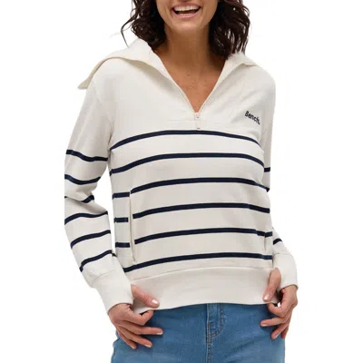 The Nara Half-Zip Stripe Pullover by Bench blends style and functionality for casual wear. Featuring a sophisticated funnel neck with a half-zip, it's versatile for various seasons. Its timeless striped design ensures wardrobe longevity, while dropped shoulders offer a relaxed fit. Ribbed cuffs and waistband enhance comfort, with thumbholes and a kangaroo pocket adding practicality. Ideal for errands or casual outings, this sweater epitomizes modern style and functionality. Funnel neck with half-zip Striped design Ribbed cuffs with thumbholes Kangaroo front pocket Dropped shoulders