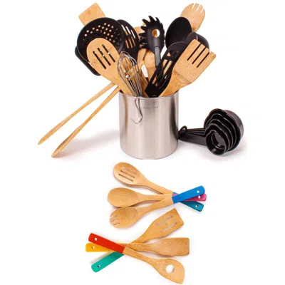 The ultimate set for any beginner chef or those looking to massively overhaul their kitchen tools.What it does: Measure, stir and whisk ingredients together to create a perfect meal with these kitchen tools crafted of bamboo, stainless steel and nylon.Includes:- 11.75" tongs- 11.75" salad fork- 11.75" salad spoon- 11.75" slotted spoon- 11.75" fork- 12" slotted turner- 12" turner- 12" basting brush- 12.5" slotted turner- 11.75" large slotted turner- 11.75" soup ladle- 12.25" solid spoon- 12.25" slotted spoon- 11.75" spaghetti server- 12.5" skimmer- 12.5" cake server- 10" whisk- 5.5" tub- 1/8 measuring cup- 1/4 measuring cup- 1/3 measuring cup- 1/2 measuring cup- 1 measuring cup- 2 spatulas- 4 spoons Bamboo/nylon/stainless steel Hand wash Imported CA WARNING: this item can expose you to titanium dioxide, nickel & nickel compounds, known carcinogens and/or reproductive toxicants. See below link for more details on Proposition 65