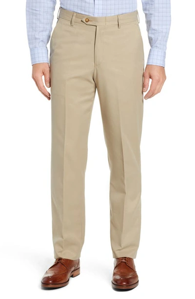 Classic Fit Flat Front Microfiber Performance Trousers In Tan