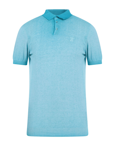 knitted, mélange, lightweight knit, no appliqués, two-tone, polo collar, short sleeves, button closing, no pockets , Color: Turquoise , Size: L