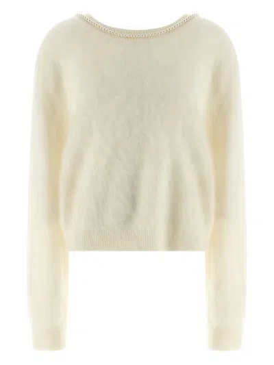 solne' brushed cashmere sweater with wide round back neckline with removable pearl necklace detail, long sleeves with cuffs and dropped shoulders.
