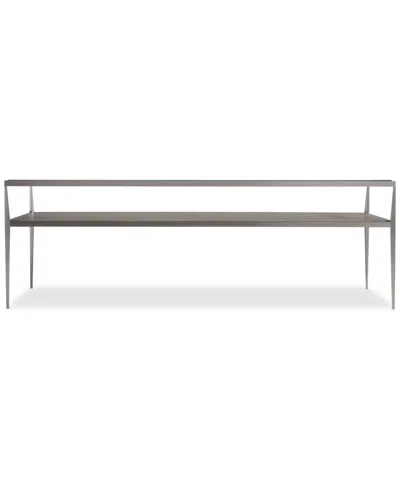 Sleek and elegant, the Cornelia cocktail table offers a streamlined profile in cast brushed stainless steel. Slim tapered legs support a rectangular glass top and a center wood shelf in the Nebbia finish.