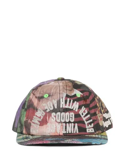 brown and multicolour all-over graphic print adjustable strap top button curved peak eyelet detailing