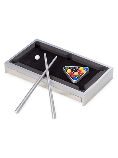 This modern desktop pool table set is a perfect addition to your game collection. Aluminum. Wipe clean. Imported. SPECIFICATIONS. Measurements, 8 x 1.2 x 4.5 inches. Weight, 1.25lbs.