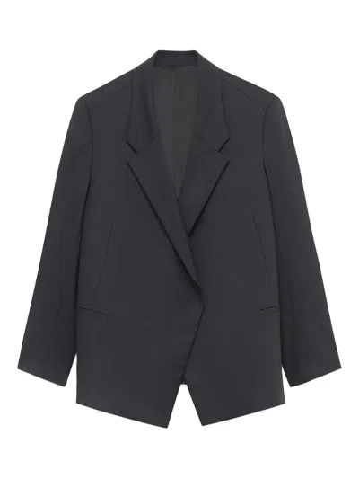black asymmetric lapel single-breasted long sleeves welt pockets straight hemline