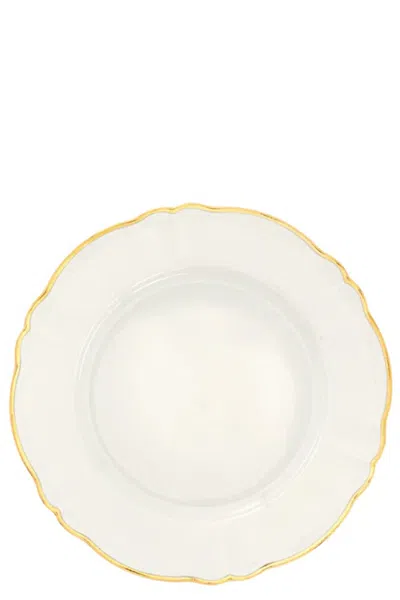 Ivory porcelain plate with gold border. Suitable for dishwashers - Max 250 washes. Not suitable for microwave. Composition: 100% porcelain Size & Fit: ⌀ 26,5 cm