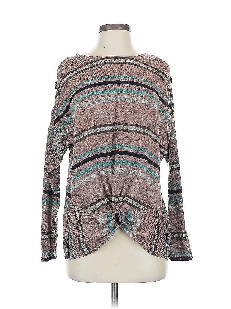 BKE Pullover Sweater, Size: Small. Item Details: Gray, Stripes Pattern, Keyhole Neckline, Long Sleeve, Ruched, Women's Tops, Polyester/Spandex