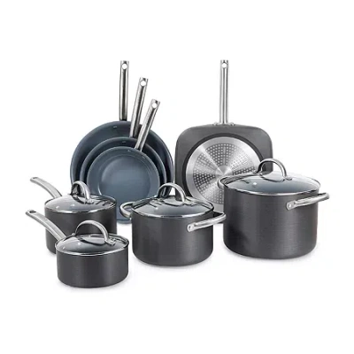 Elevate your culinary experience with the black+decker 12-piece ceramic hard anodized aluminum cookware set. This meticulously crafted pot and pan set combines durability, versatility, and superior performance to meet all your cooking needs. Engineered with a hard anodized aluminum body, these pots and pans ensure exceptional heat transfer and uniform heat distribution, allowing you to achieve perfectly cooked meals every time. The set features a dark gray ceramic high-performance non-stick coating, providing a non-toxic cooking surface that is free from pfoa and ptfe. Ergonomically designed riveted stainless-steel handles offer a comfortable and secure grip, making maneuvering and handling a breeze. The black+decker cookware set is suitable for all cooktops, including induction. The pots and skillet pans are oven and broiler safe up to 500°f, expanding your culinary possibilities. The tempered glass lids allow you to monitor your cooking progress without losing heat or moisture, ensuring your dishes are cooked to perfection. These lids are dishwasher safe for added convenience, though the cookware itself should be hand washed to maintain its pristine condition. This comprehensive kitchen set includes: a 1.5-qt saucepan with lid, 3-qt saucepan with lid, 4-qt. Casserole with lid, 8-qt. Stockpot with lid, 8" skillet, 10" skillet, 12" skillet and 11" square griddle. Whether you are a professional chef or a home cook, this nonstick cookware set offers everything you need for a seamless cooking experience. The nonstick pots and pan set is designed to withstand the rigors of daily use while maintaining its elegant appearance. Elevate your kitchen with this high-quality, nonstick, and non-toxic cookware set from black+decker, where superior performance meets unparalleled durability.# Pieces In Set: 12Included: 1 10 Inch Skillet(s), 1 1.5 Qt. Saucepan(s) With Lid(s), 1 8 Qt. Stock Pot(s) With Lid(s), 1 8 Inch Skillet(s), 1 11 Inch Griddle Pan(s), 1 3 Qt. Saucepan(s) With Lid(s), 1 12 Inch Skillet(s)Features: Pfoa Free, Oven Safe, Ptfe Free, Non-StickCooktop Compatibility: Electric, InductionManufacturer Warranty: 1 Year LimitedShape: OvalMaximum Temp (f): 500 Degrees FCare: Hand WashDecor Styles: ModernMaterial: AluminumCountry of Origin: Imported
