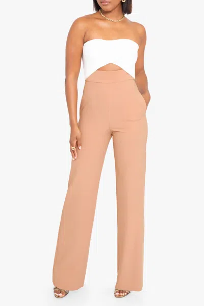 The Jada Color Block Jumpsuit is a bold yet refined take on modern tailoring. Designed with a sculpted sweetheart neckline and a striking center front cutout, this strapless silhouette highlights the waist before falling into fluid wide-leg pants. The high-waisted design elongates the legs while the sleek contrast bodice adds a sharp elevated edge.