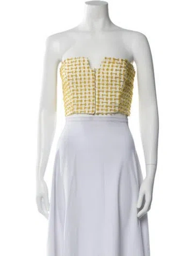 Black Iris Crop Top White & Yellow Patterned Pom-Pom & Grosgrain Accents Strapless Hook & Eye Closure at Front Fit: Tops by Black Iris typically fit true to size. | Black Iris Patterned Strapless Crop Top in White/Yellow, Women's XS