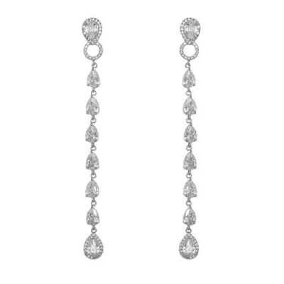 Set of dangling earrings with crystal stones. Made with premium rhodium plated brass. Color + Material: Rhodium plated brass. Height: 120mm Plating Thickness: 1.5um rhodium