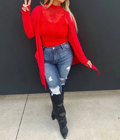 Throw this adorable cardigan over any cami or tank top.Introducing the Ribbed Open Cardigan by BLAKELEY, a chic addition to your wardrobe in vibrant red. This long sleeve duster features convenient patch pockets and is crafted from a comfortable blend of 95% Rayon and 5% Spandex, offering a lightweight feel. Made in the USA, its knee-length design adds an elegant touch with a V-neckline and thumb holes for a cozy fit. Perfect for layering, this solid cardigan effortlessly enhances any outfit.